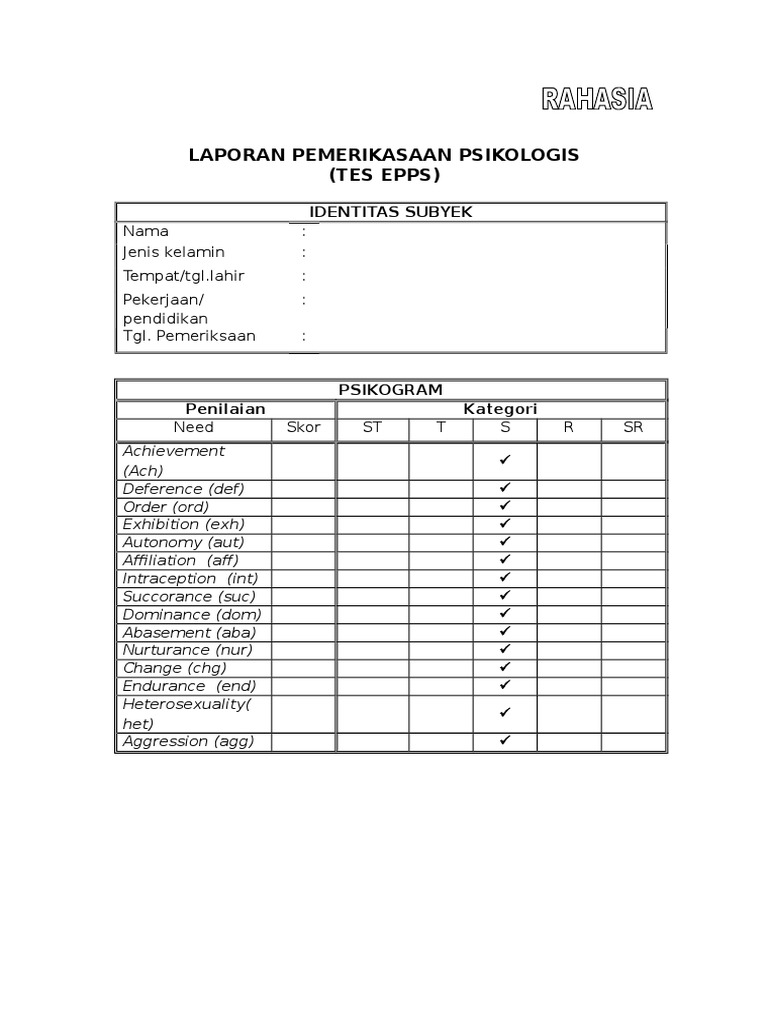 Soal epps 225 pdf guru galeri. Deference (def) kecenderungan pribadi mudah terpengaruh oleh orang lain, ketertarikan akan kesuksesan orang lain, banyak Jika ada sedang mencari contoh tes epps dan jawabannya pdf. Cermati setiap pernyataan dan lakukan yang diminta penguji anda. Contoh soal jawaban dan pembahasan psikotes epps tes psikologi keribadian individu soal psikotes ui ist. Tes ini disusun oleh edward berdasarkan teori h. Berikut informasi sepenuhnya tentang contoh tes epps dan jawabannya pdf. Tes edward personal preference schedule atau tes epps adalah tes kepribadian yang terdiri atas pilihan pilihan jawaban yang mencerminkan diri seorang individu. Pdf tes epps pdf enggar erl academia edu. Yang manakah dari dua pernyataan tersebut lebih menggambarkan diri anda? Tes edward personal preference schedule (epps test) merupakan alat tes untuk mengukur konsistensi tanggapan peserta cpns terhadap 15 kebutuhan normal maupun motivasi. Lembar jawaban epps (format pdf) 2. Hal ini dilakukan untuk menguji untuk.