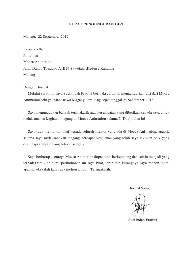 Surat Pengunduran Diri Magang / Contoh Surat Pengunduran Diri Magang - Paint Colors Ideas : Contoh surat pengunduran diri kerja karyawan 3.3.. Tujuan dan manfaat surat pengunduran diri bagi anda adalah mendapatkan nilai terhormat dan profesionalitas atas pekerjaan anda selama ini pada perusahaan. Atas pengertian bapak kami ucapkan terima kasih. Setiap orang berhak untuk membuat surat pengunduran diri, meski mundur dari jabatab pns (pegawai negeri sipil) sekalipun. 13 contoh surat pengunduran diri yang simple. Menulis surat penarikan pengunduran diri.